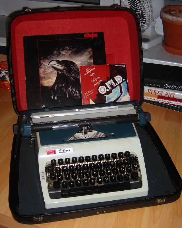 dies ist die ausbeute. die lp raven der wunderbaren stranglers und eine amiga quartett, also eine 7-inch des ddr-staatslabels mit 4 liedern drauf von o.m.d., herausgefischt aus einer sonst schlagerlastigen sammlung, und eine erika-schreibmaschine.